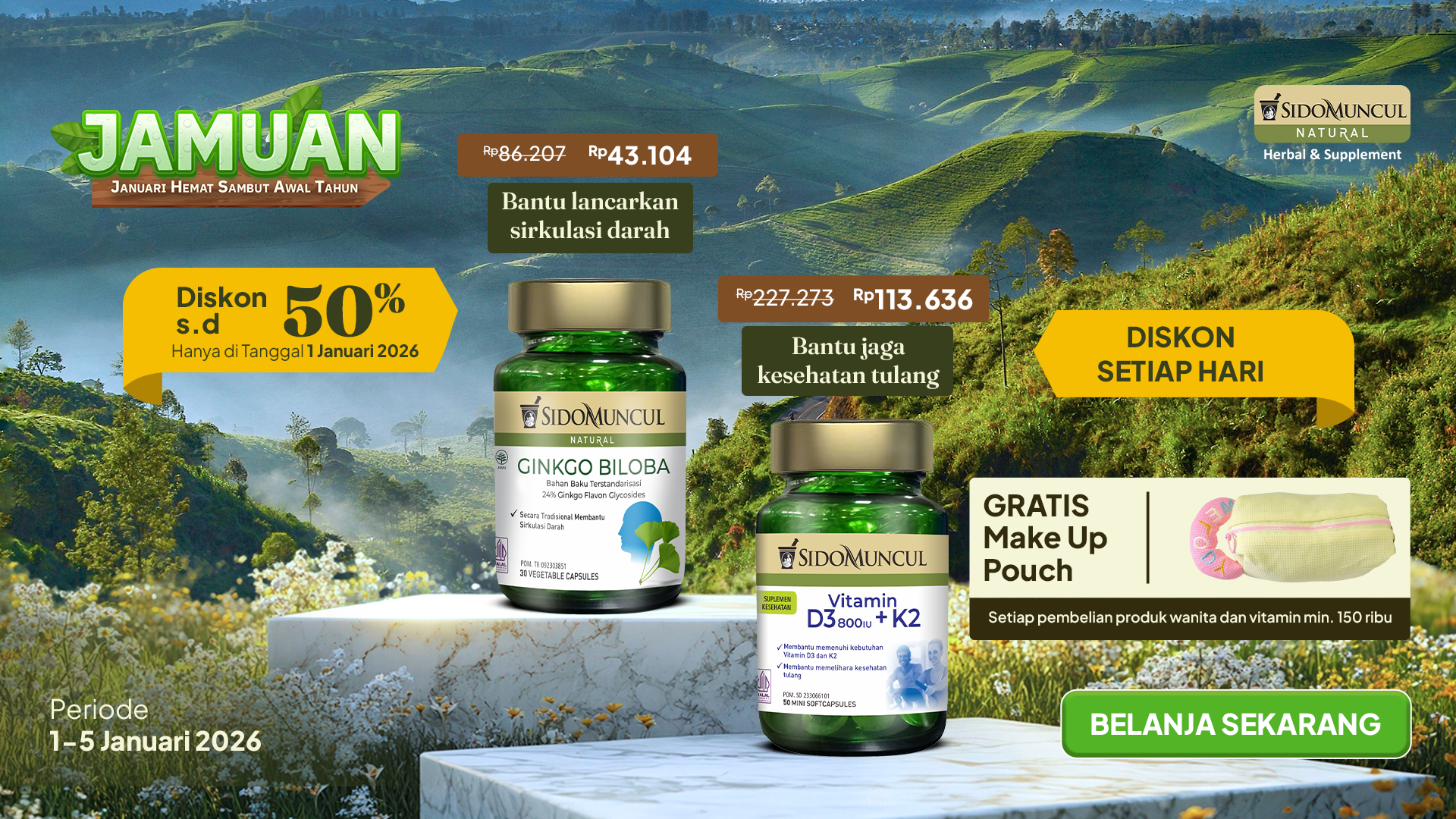 Sido Muncul Natural siap menjadi pilihan suplemen terbaik untuk menjaga kesehatan tubuhmu, baik untuk saat ini maupun di masa mendatang