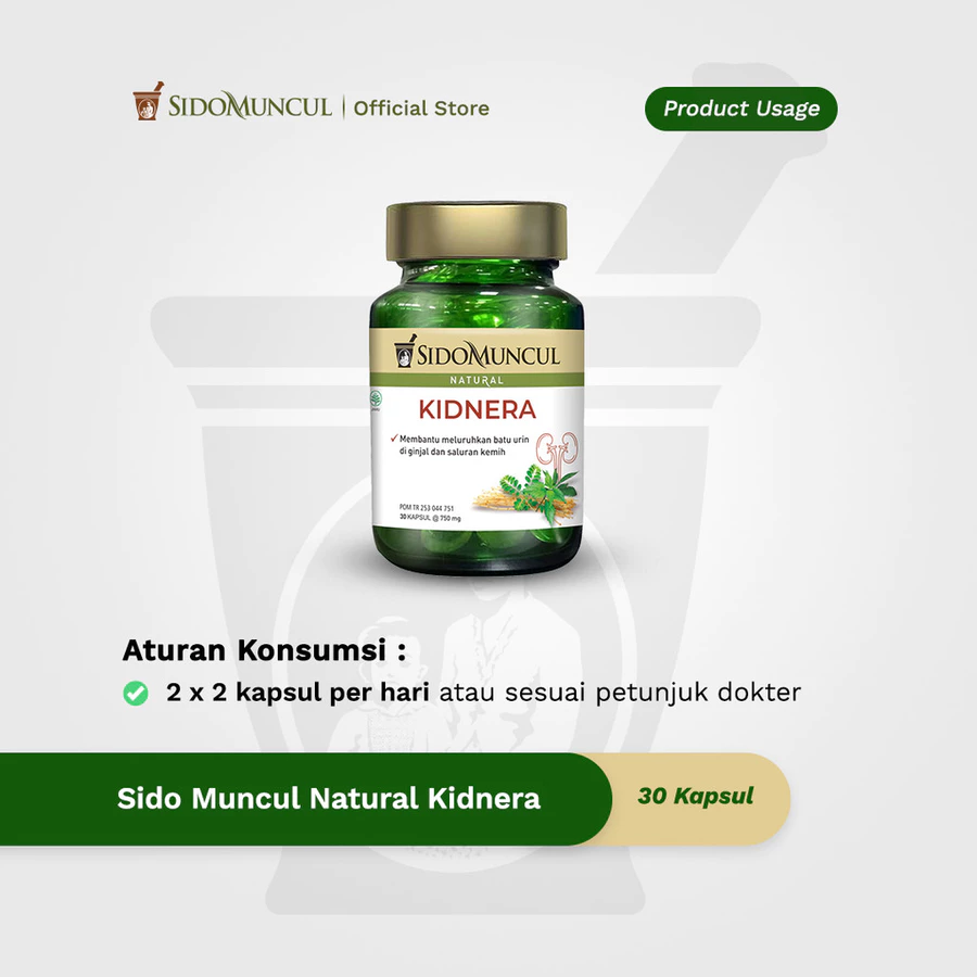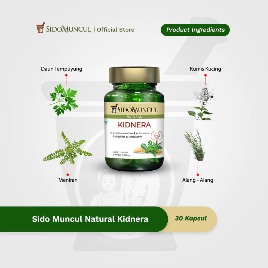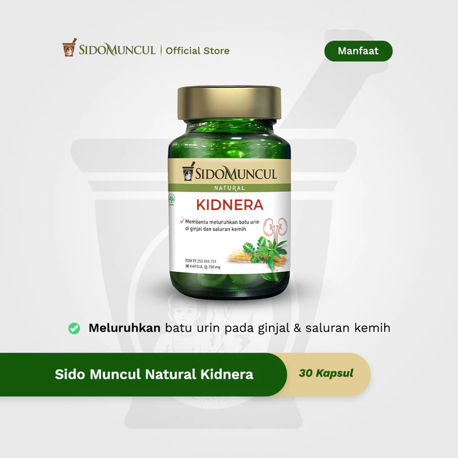 Sido Muncul Natural Kidnera 30 Kapsul merupakan formula herbal terpercaya untuk membantu meluruhkan batu urin di ginjal dan saluran kemih. Kidnera mengandung Daun tempuyung, kumis kucing, daun meniran, dan alang-alang dengan manfaat yang saling melengkapi untuk membantu meluruhkan batu urin.